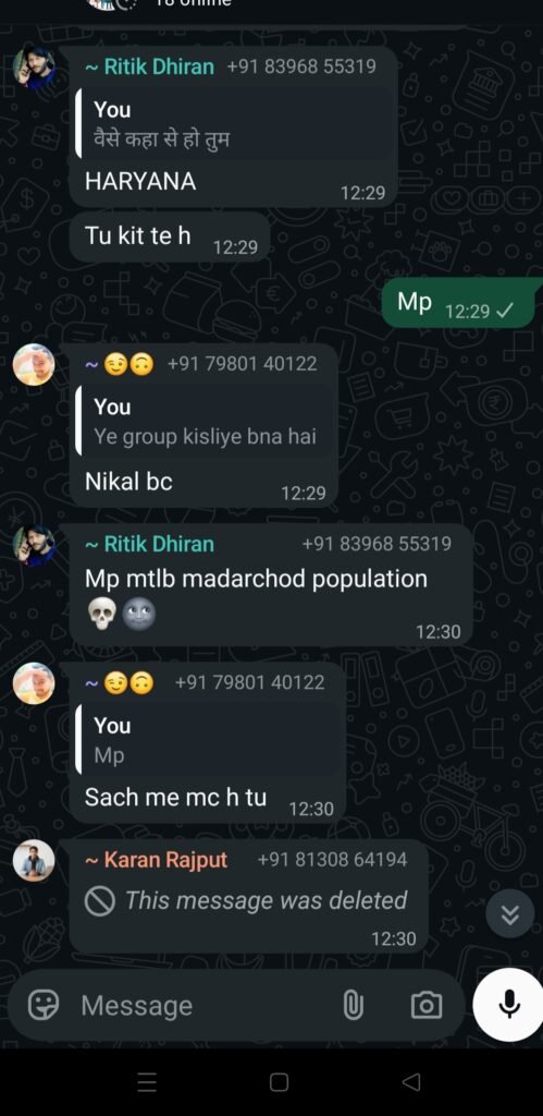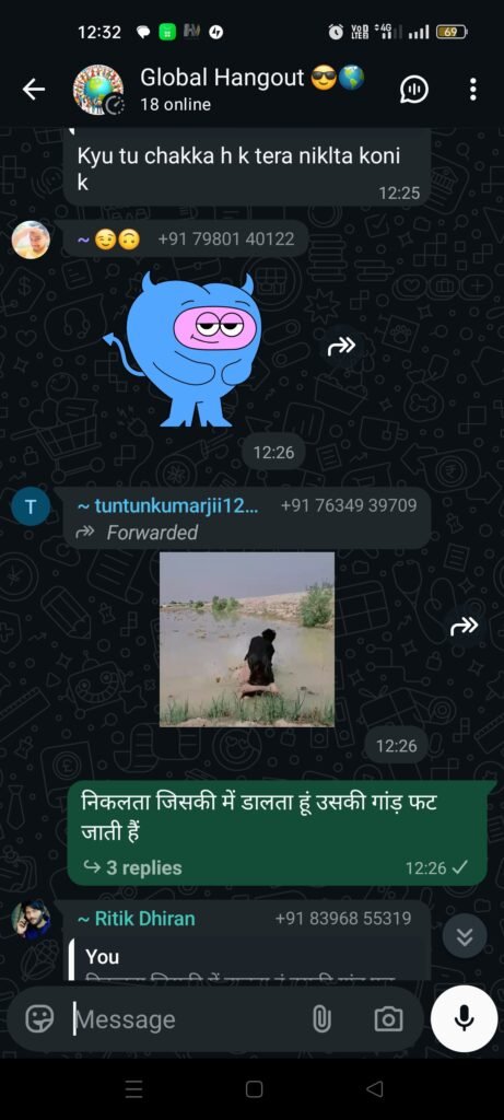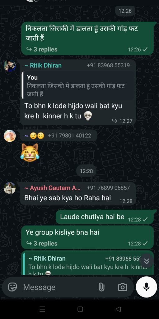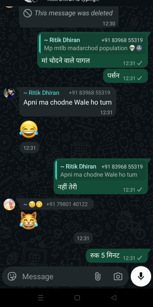 चैट में गाली-गलौज और क्षेत्रीय टिप्पणी जैसे संदेश सामने आए हैं, जो सामाजिक मर्यादा के खिलाफ हैं।इस मामले में कुछ मोबाइल नंबरों से जुड़े व्यक्तियों पर आरोप लगाए गए हैं, जिनमें रितिक और सुनील नाम सामने आए हैं।