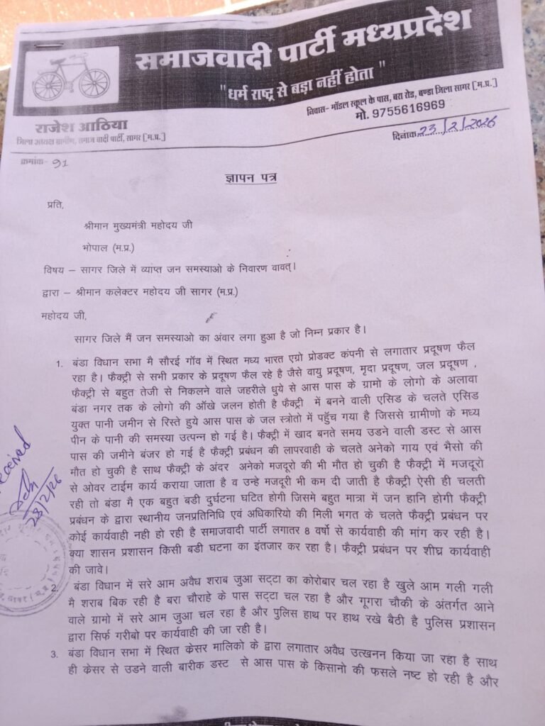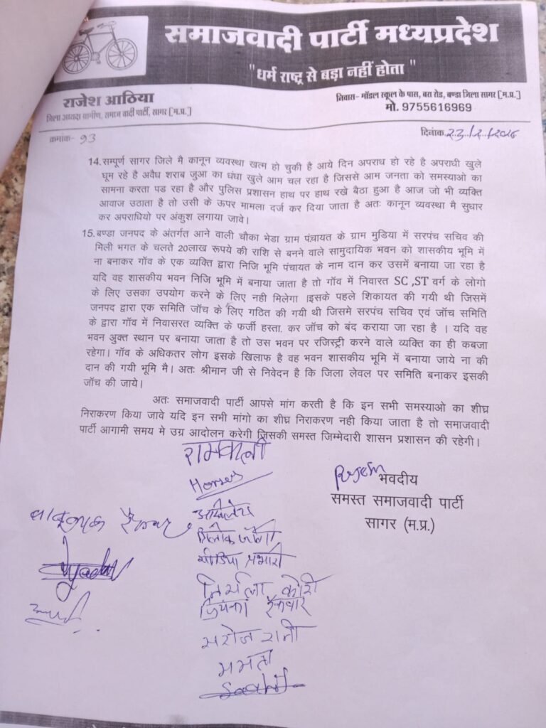 सागर –समाजवादी पार्टी के जिला अध्यक्ष राजेश आठिया ने सागर जिले में खत्म हो चुकी कानून व्यवस्था एवं जिले में अन्य व्याप्त जन समस्याओं को लेकर मुख्यमंत्री को उद्घोषक ज्ञापन कलेक्टर सागर को सोंपा ज्ञापन में बताया गया है कि सागर जिले में आए दिन चोरी लूट हत्याओं जैसे मामले बढ़ते जा रहे हैं सागर में कानून व्यवस्था बिल्कुल खत्म हो चुकी है नरयावली विधानसभा बंडा विधानसभा में खुलेआम अवैध शराब सट्टा एवं जुआ का कारोबार चल रहा है और पुलिस कुछ नहीं कर रही है बंडा विधानसभा के सोंरई ग्राम में स्थित मध्य भारत एग्रो प्रोडक्ट कंपनी से लगातार प्रदूषण फैल रहा है जिससे आसपास के ग्रामीणों को अनेको समस्याओं का सामना करना पड़ रहा है फैक्ट्री प्रबंधन की लापरवाही के चलते अनेकों मवेशी एवं मजदूरों की जान जा चुकी है फैक्ट्री प्रबंधन मजदूरों को मजदूरी के अनुसार मजदूरी नहीं दे रहा है और अतिरिक्त कार्य भी कराया जा रहा हैं जब मजदूरों के द्वारा मजदूरी मांगी जाती है तो उनसे लड़ाई झगड़ा और उनके साथ मारपीट की जाती है नरयावली विधानसभा की नगर परिषद कर्रापुर में आवास वितरण में एवं निर्माण कार्य में भ्रष्टाचार किया जा रहा है इसकी जांच की जानी चाहिए साथ ही बीना विधानसभा के बस स्टैंड पर अवंती बाई की मूर्ति में भारी भ्रष्टाचार किया गया है मूर्ति नकली लगाई गई है जिसकी जांच की जानी चाहिए साथ ही समाजवादी पार्टी ने बुजुर्गों व विधवा महिलाओं एवं दिव्यांगों को सरकार के द्वारा दी जाने वाली राशि बढ़ाने की मांग की एवं जो लाडली बहनाओं में महिलाएं रह गई है उनके फार्म भरवाए जाएं इसी देवरी नगर में अवैध कॉलोनीयो का कारोबार बहुत तेजी से चल रहा है अतः अवैध कॉलोनी की जांच की जाए तरह से सागर जिले में व्याप्त अन्य समस्याएं भी ज्ञापन में शामिल है ज्ञापन सौंपने वालों में मुख्ता डॉ आसिफ अली प्रदेश सचिव, हेमराज लोधी राष्ट्रीय अध्यक्ष प्रगति मानव कल्याण परिषद ,रामकली रैकवार जिला अध्यक्ष महिला सभा ,साहिल यादव जिला अध्यक्ष पिछड़ा वर्ग प्रकोष्ठ, सुंदर लाल यादव पूर्व जिला अध्यक्ष, बाबूलाल रैकवार जिला महासचिव ,बसीर गनी जिला उपाध्यक्ष, त्रिलोक जोगी मीडिया प्रभारी ,सुरेंद्र यादव विश्वविद्यालय अध्यक्ष छात्र सभा, अखिलेश लोधी जिला अध्यक्ष प्रगति मानव कल्याण परिषद, निर्मला कोरी, प्रियंका रैकवार ,सरोज रानी ,ममता आदि के अलावा सैकड़ो कार्यकर्ता उपस्थित रहे