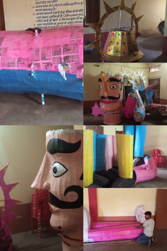 कदीर अहमद ने तफ़सील देते हुए बताया, “तीनों पुतले तैयार करने में 10 से 15 दिन का समय लग जाता है। इन्हें खड़ा करने और सजाने के लिए बाँस, रद्दी पेपर, गिफ्ट पेपर, और मैदा जैसी सामग्रियां बहुत मात्रा में लगती हैं।” उन्होंने बताया कि अभी भी काफी काम बाकी है।