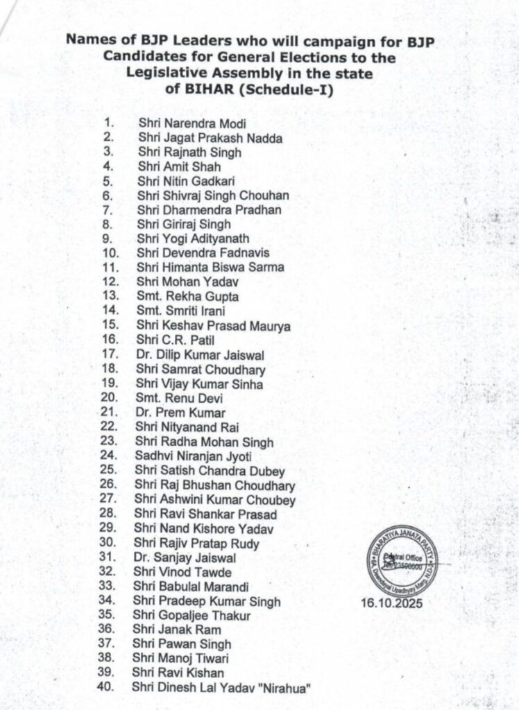 पटना: बिहार विधानसभा चुनाव 2025 के लिए भारतीय जनता पार्टी (BJP) ने अपने प्रचार अभियान को धार देते हुए स्टार प्रचारकों (Star Campaigners) की सूची जारी कर दी है। 16 अक्टूबर 2025 को जारी इस 40 दिग्गजों की सूची में प्रधानमंत्री नरेंद्र मोदी से लेकर कई राज्यों के मुख्यमंत्री और भोजपुरी सिनेमा के सुपरस्टार्स तक शामिल हैं। यह सूची बताती है कि पार्टी ने एनडीए उम्मीदवारों के लिए राज्य भर में जीत सुनिश्चित करने हेतु एक सघन और बहुआयामी रणनीति तैयार की है।