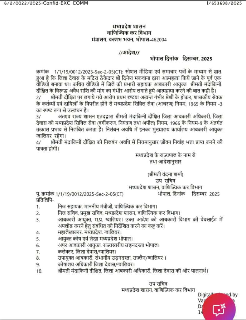 - निलंबन अवधि के दौरान मंदाकिनी दीक्षित का मुख्यालय आबकारी आयुक्त कार्यालय, उज्जैन निर्धारित किया गया है।