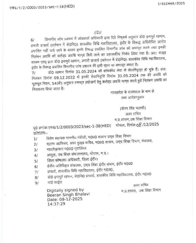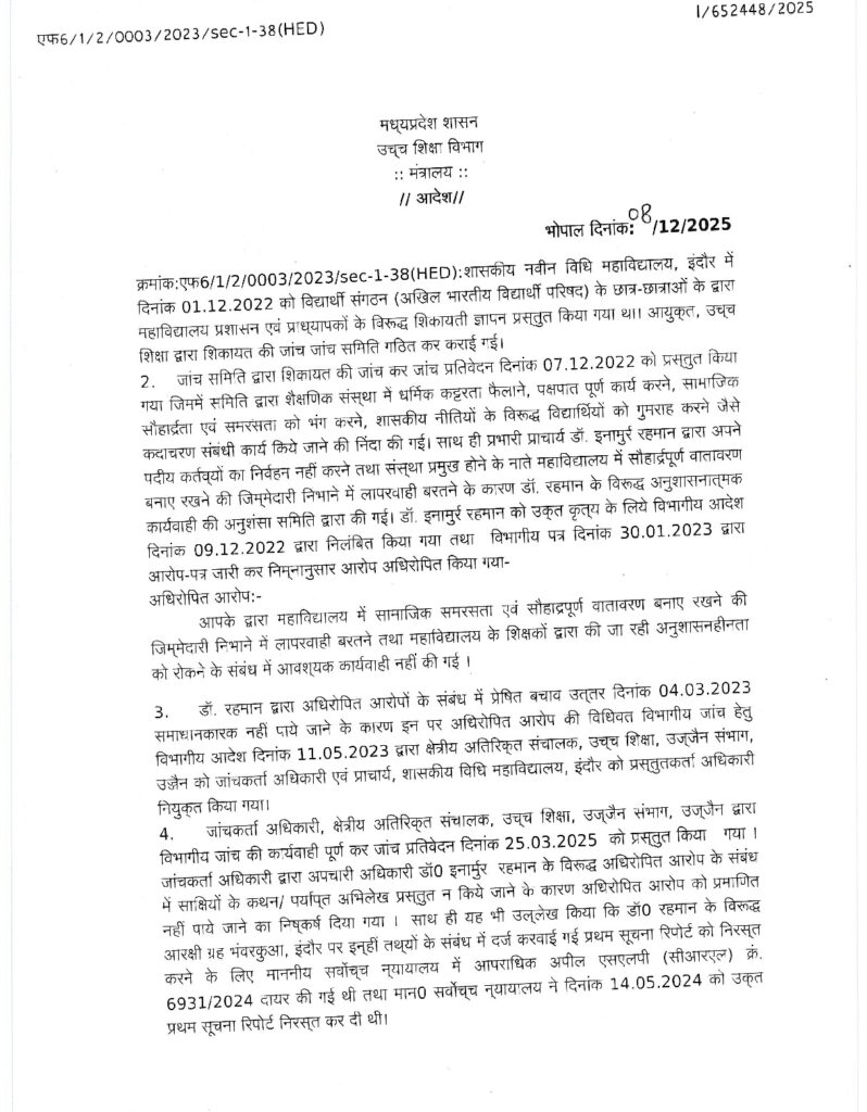 इंदौर। इंदौर स्थित शासकीय नवीन विधि महाविद्यालय के पूर्व प्राचार्य डॉ. इनामुर रहमान को लगभग तीन वर्षों बाद धार्मिक कट्टरता और पक्षपात फैलाने के आरोपों से पूरी तरह मुक्त कर दिया गया है। मध्य प्रदेश शासन के उच्च शिक्षा विभाग ने विभागीय जांच पूरी होने के बाद 8 दिसंबर 2025 को आदेश जारी कर उन्हें क्लीनचिट प्रदान की है और निलंबन अवधि को ड्यूटी पीरियड मानते हुए सभी वैधानिक लाभ देने के निर्देश दिए हैं।