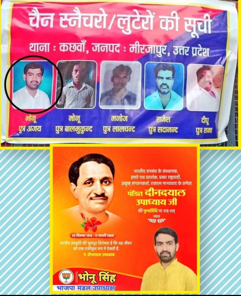 मिर्ज़ापुर (उत्तर प्रदेश)। मिर्ज़ापुर पुलिस द्वारा चेन स्नैचिंग और लूट की वारदातों पर अंकुश लगाने के लिए चलाए जा रहे एक अभियान ने उत्तर प्रदेश की राजनीति में बड़ा भूचाल ला दिया है। पुलिस ने अपराधियों की फोटो युक्त जो फ्लेक्सी बोर्ड चौराहों पर लगाए हैं, उसमें भारतीय जनता पार्टी (BJP) के मझवां मंडल उपाध्यक्ष भोनू सिंह का नाम और फोटो भी शामिल है।