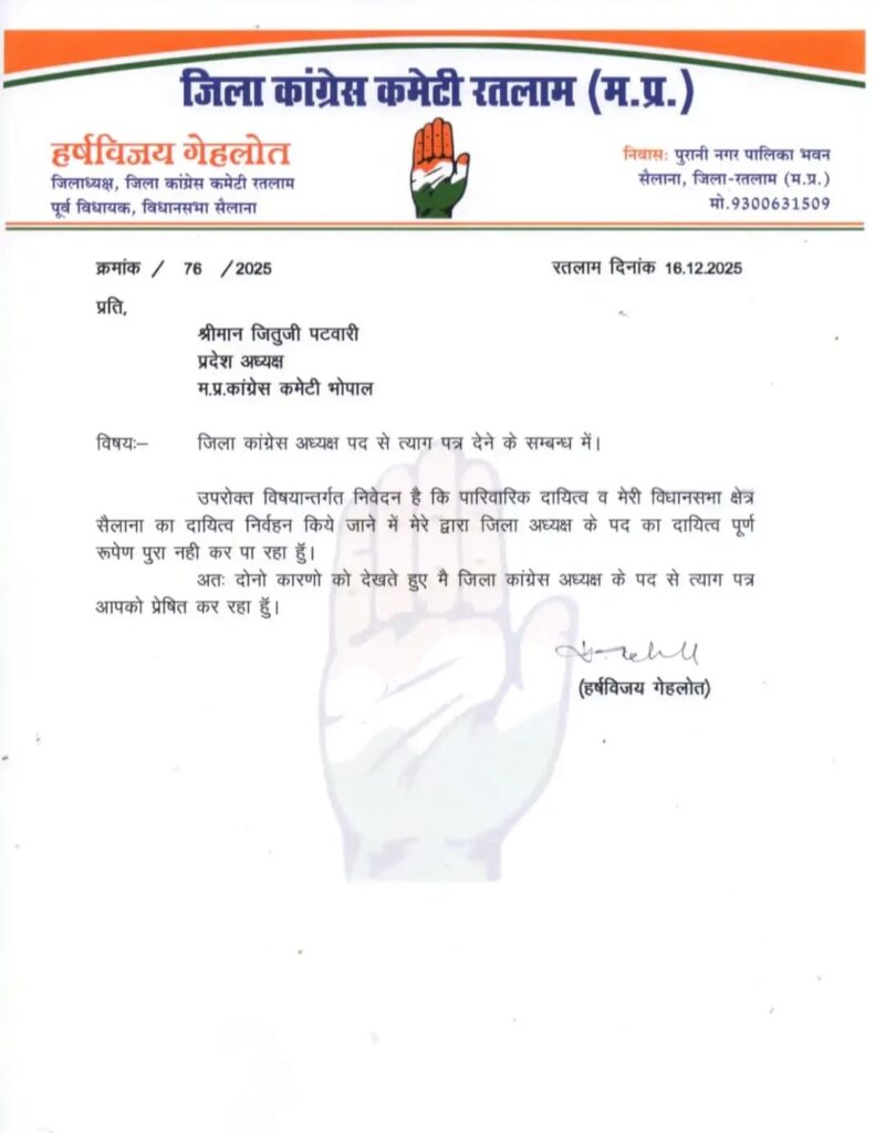 रतलाम ग्रामीण कांग्रेस जिलाध्यक्ष हर्ष विजय गहलोत का इस्तीफा, पार्टी में हलचल