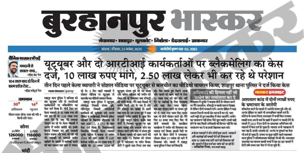 बुरहानपुर | शाहपुर थाना पुलिस ने चापोरा निवासी सुधीर पाटिल की शिकायत पर एक यूट्यूबर और दो आरटीआई कार्यकर्ताओं के खिलाफ रंगदारी का केस दर्ज किया है। पुलिस ने संजय दुबे, आनंद दीक्षित और राकेश सईवाल के खिलाफ बीएनएस की धारा 308(2) और 3(5) के तहत प्रकरण कायम किया है।